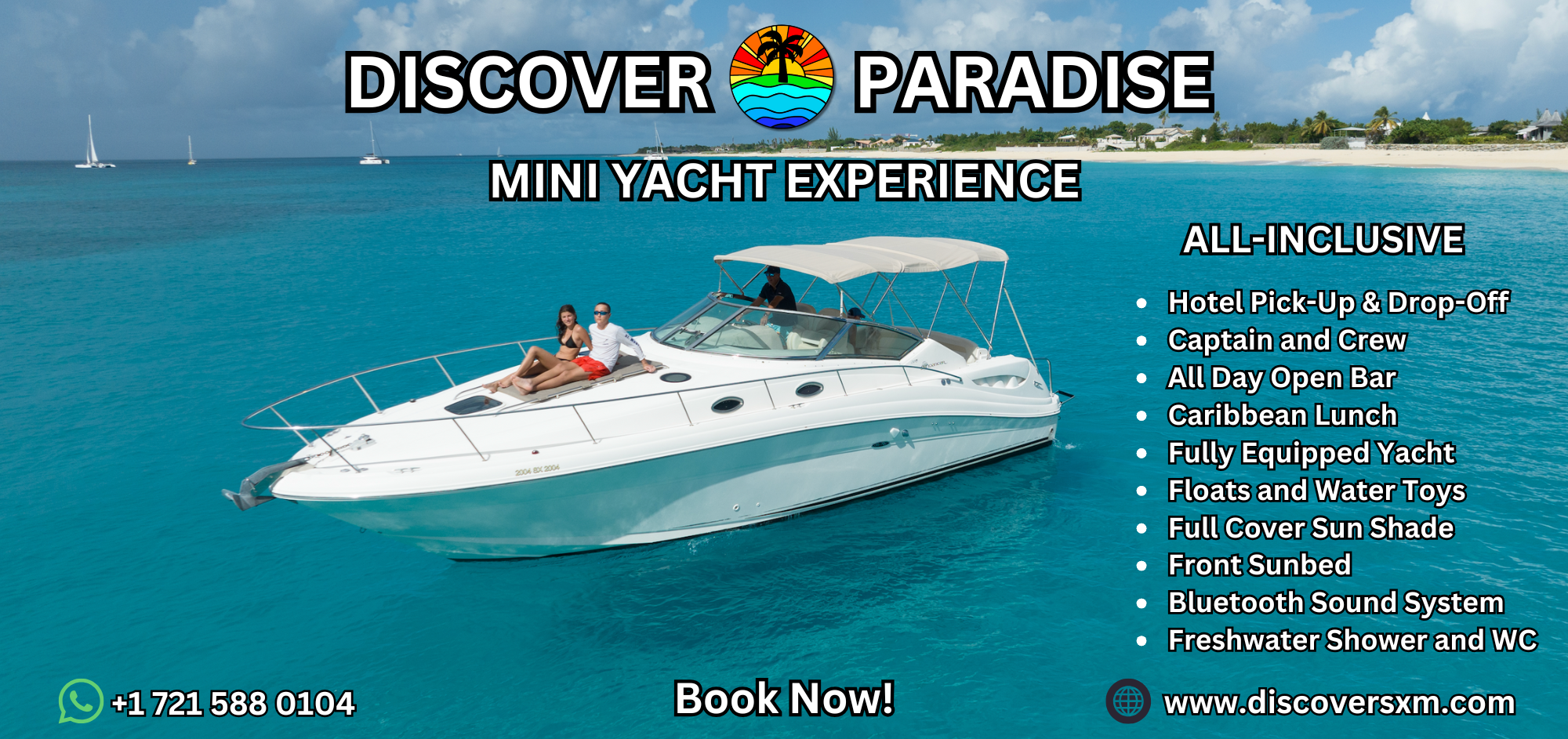 Embark on an extraordinary day of sun, sea, and style aboard your private Discover Paradise mini-yacht - a sleek, comfortable vessel designed for both adventure and relaxation. From the moment you glide under the iconic bridge at Simpson Bay, you'll enter a world where luxury meets freedom, exploring turquoise waters, white-sand beaches, and vibrant coral reefs in true Caribbean style.
